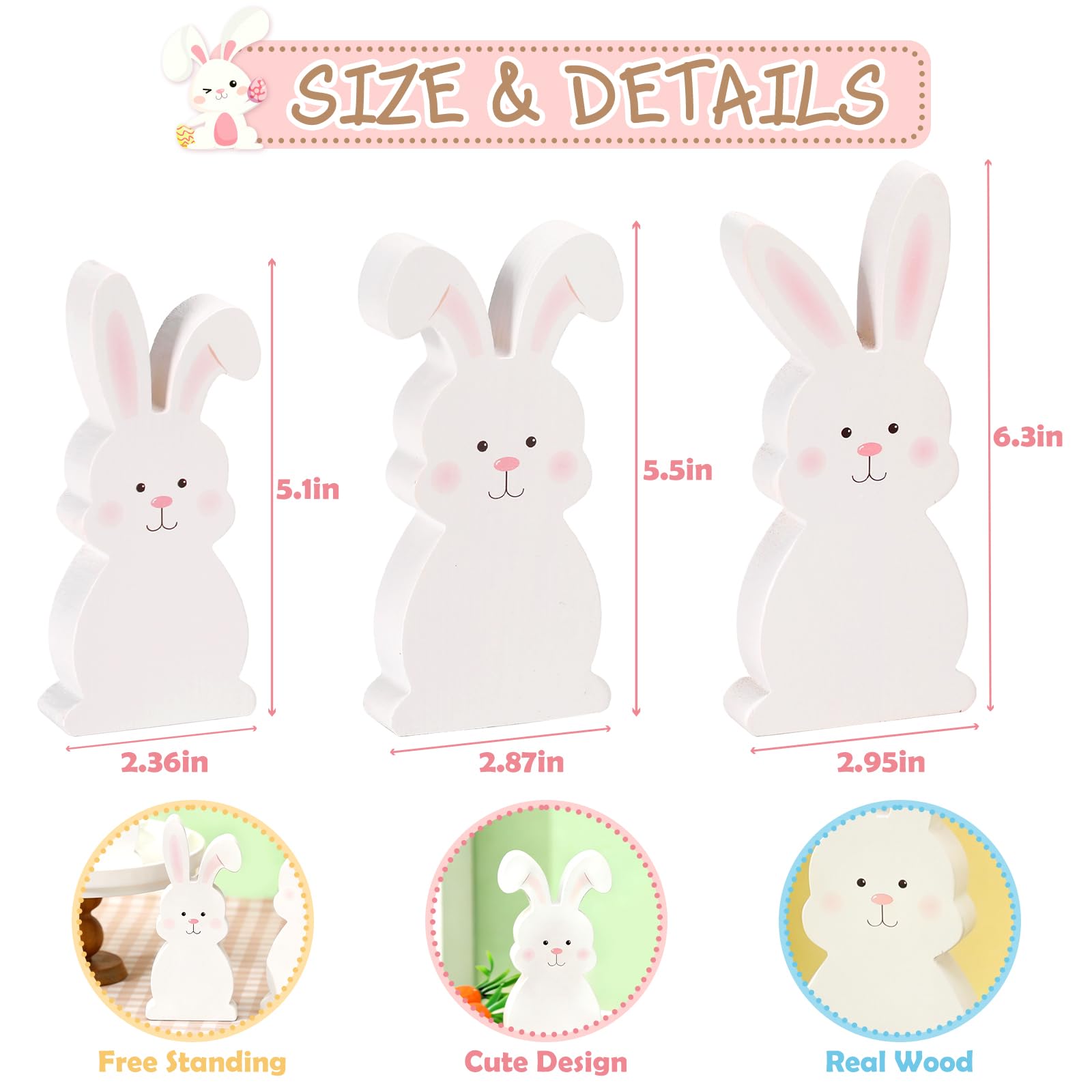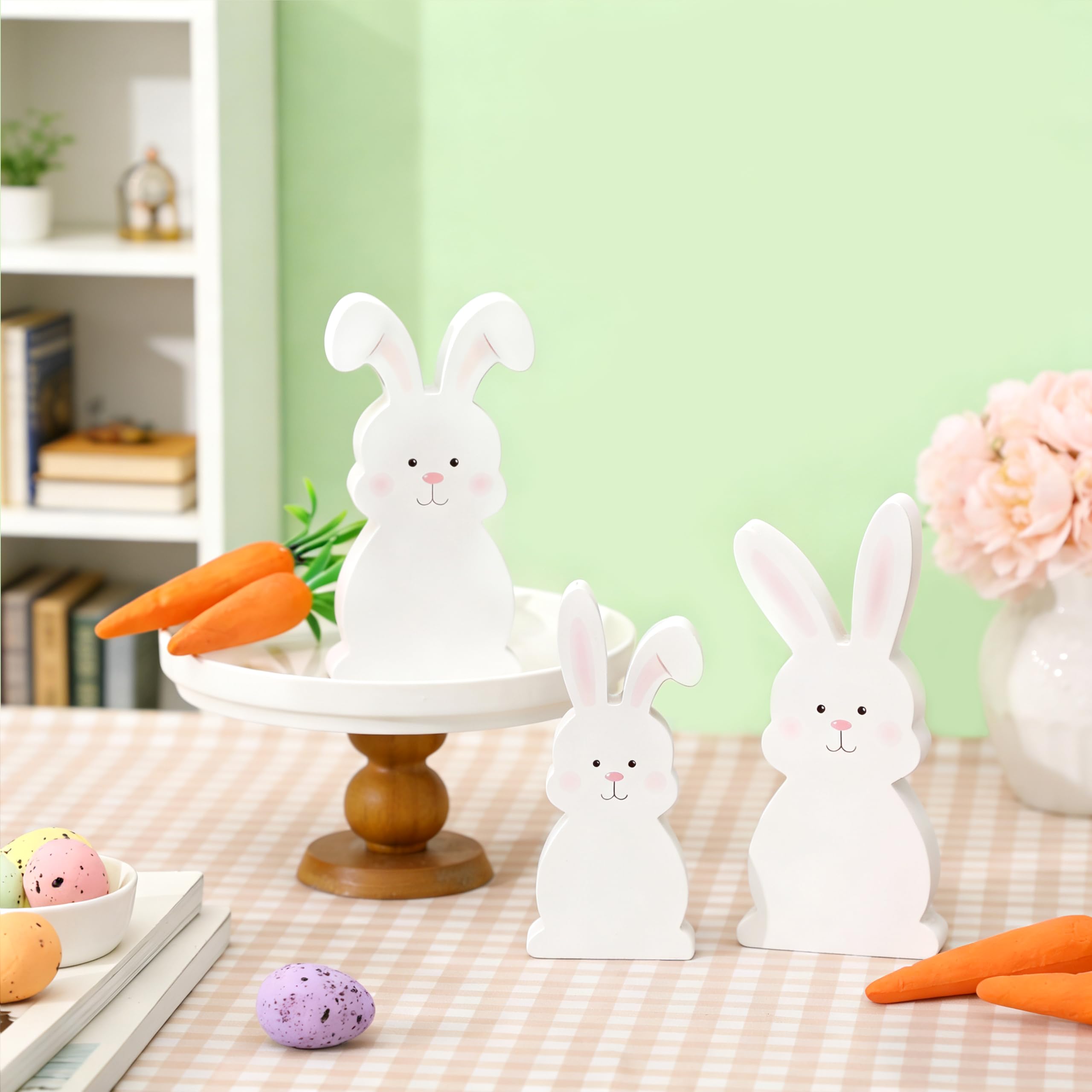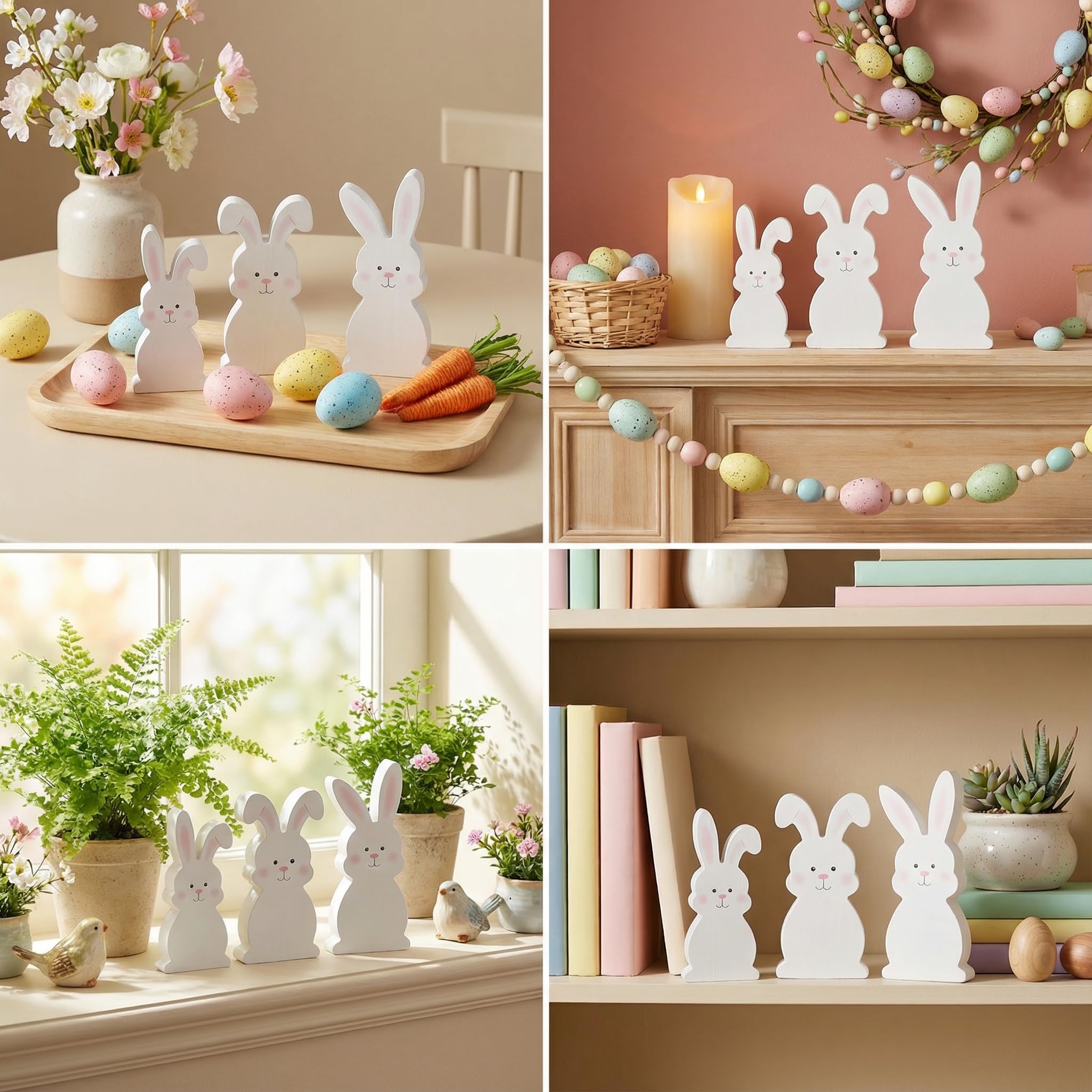 One of the best things about these freestanding bunny decor pieces is their incredible versatility. Designed to fit effortlessly into tiered tray setups—one of the most popular ways to showcase seasonal decor—they also shine as standalone rabbit ornaments throughout your home. Arrange them on mantels, shelves, side tables, or countertops; mix them with other spring florals, eggs, and pastel accents; or let them take center stage as dedicated Easter bunny decor. No matter how you style them, they seamlessly fit into your spring and Easter decorating routine.