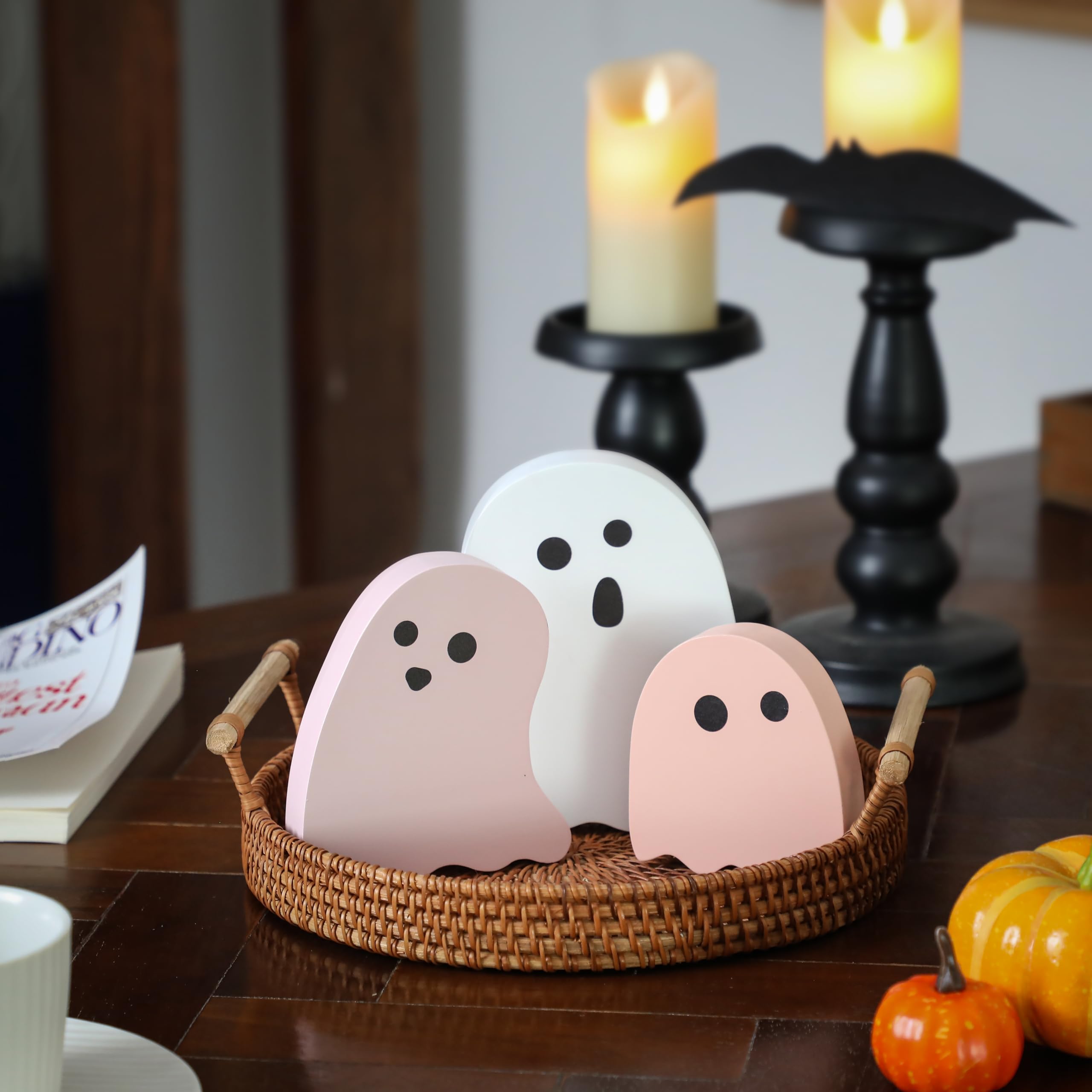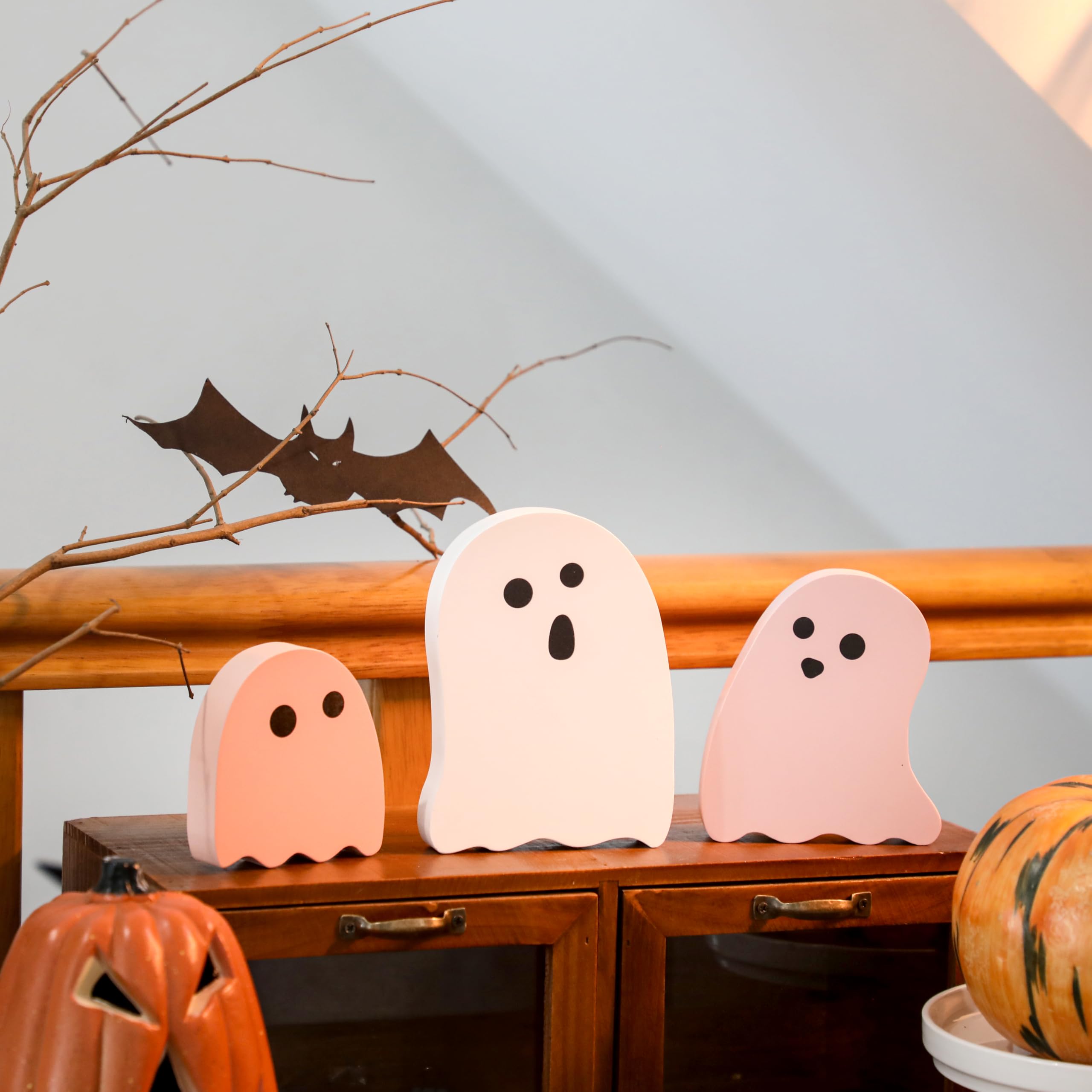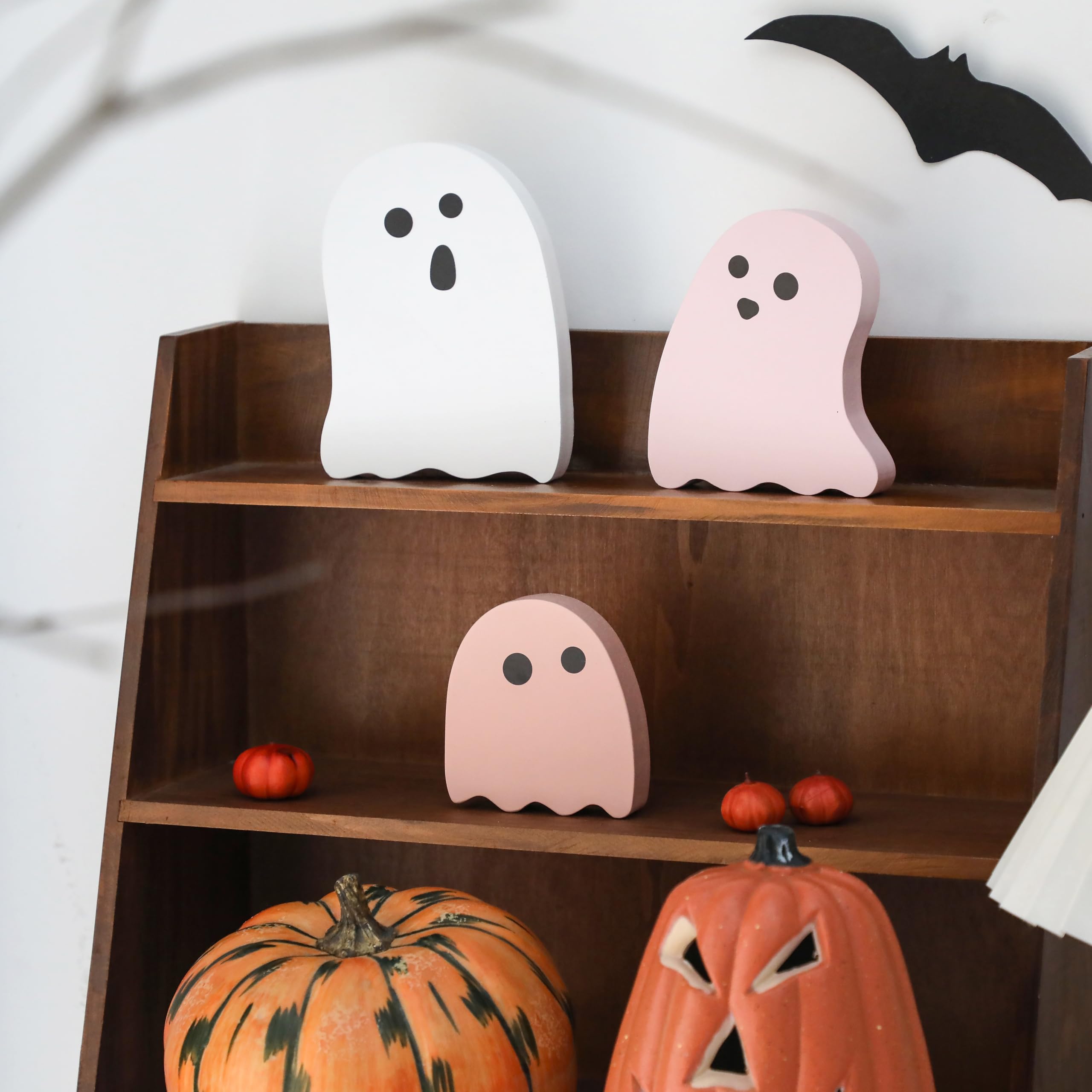 Pastel Pink & White Cute Halloween Decor Set-Package includes 2 pink + 1 white adorable ghost-shaped wooden signs, each with unique expressions. Perfect for girly Halloween decor, pastel Halloween decorations, or adding a cute spooky vibe to bedrooms, offices, and tiered trays.