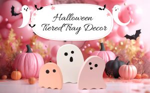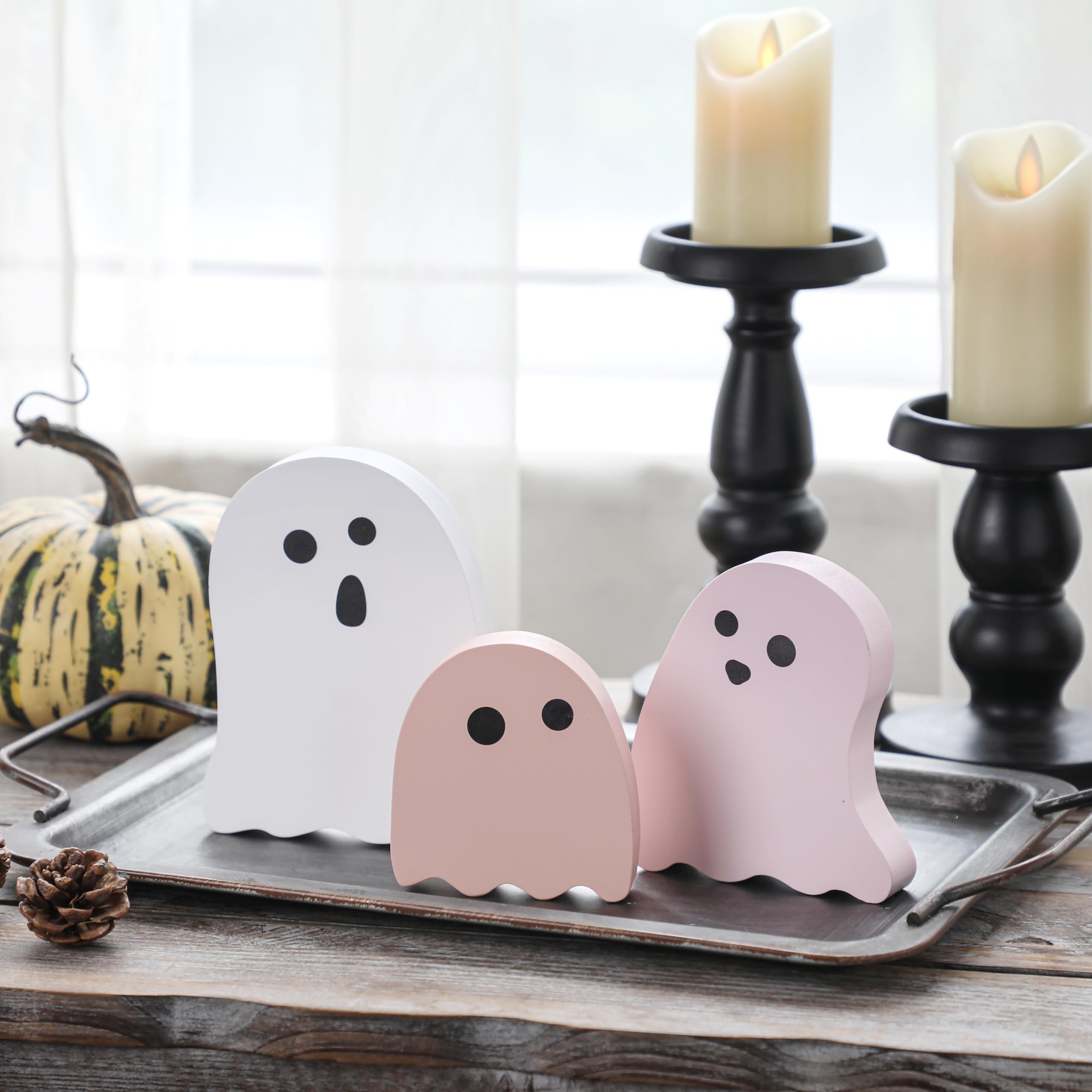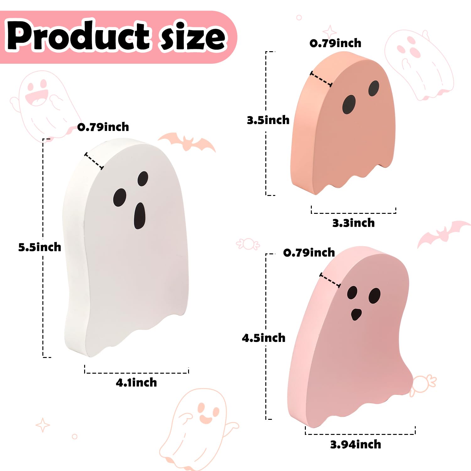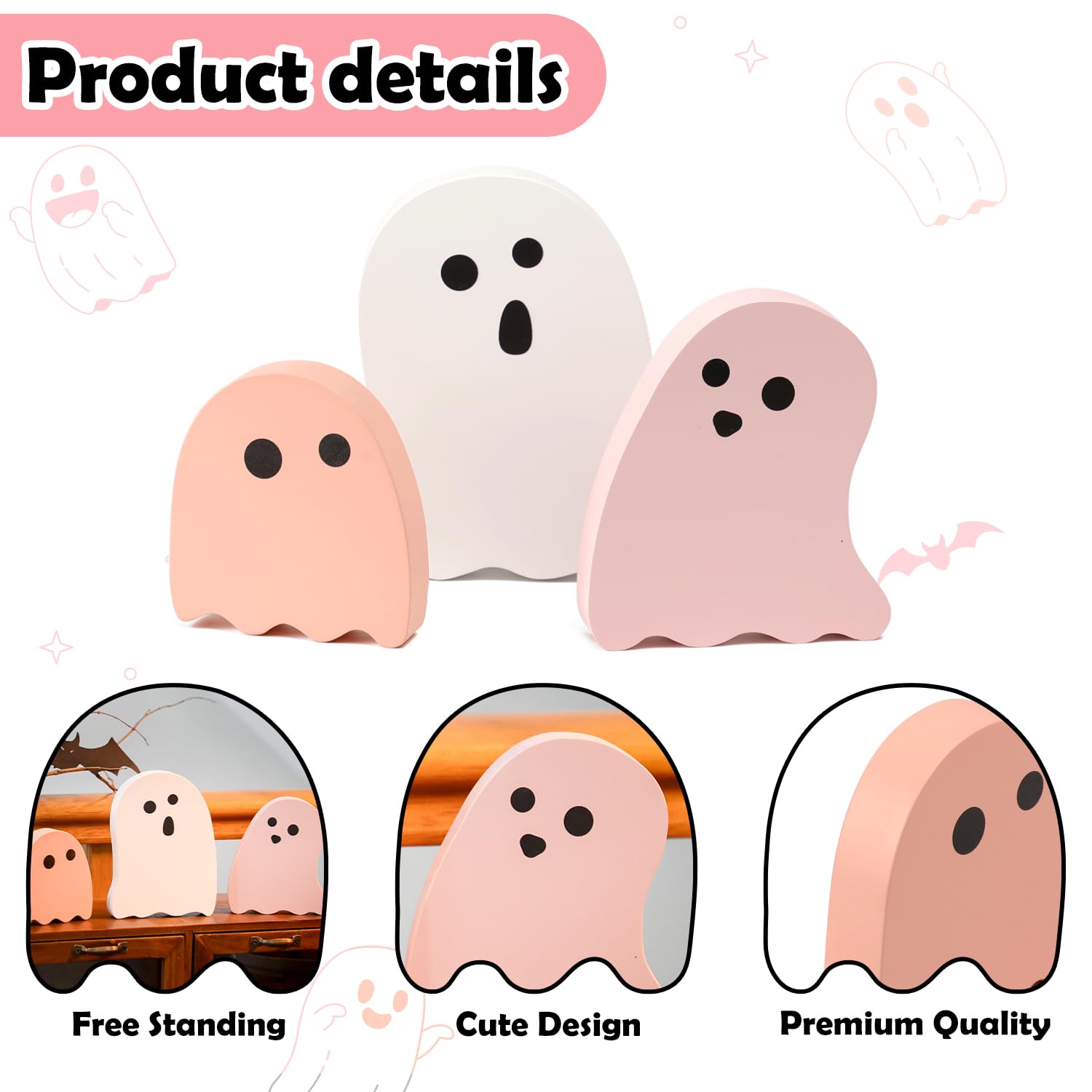 Pastel Pink & White Cute Halloween Decor Set-Package includes 2 pink + 1 white adorable ghost-shaped wooden signs, each with unique expressions. Perfect for girly Halloween decor, pastel Halloween decorations, or adding a cute spooky vibe to bedrooms, offices, and tiered trays.
